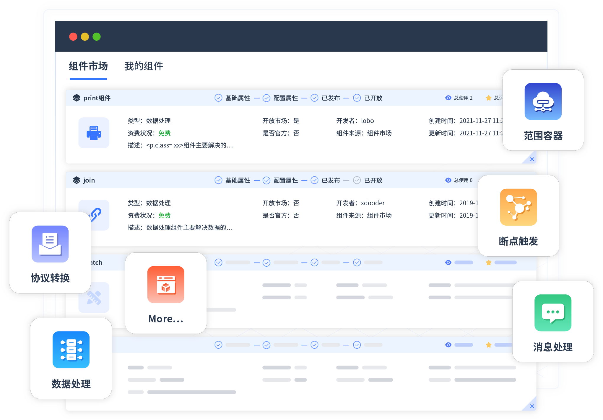针对集成场景,,,钱能钱包提供组件市场,,,例如协议转换、、、、消息处理、、文件操作等。。。。除平台提供的组件外,,,,客户可以自定义所需组件。。。。