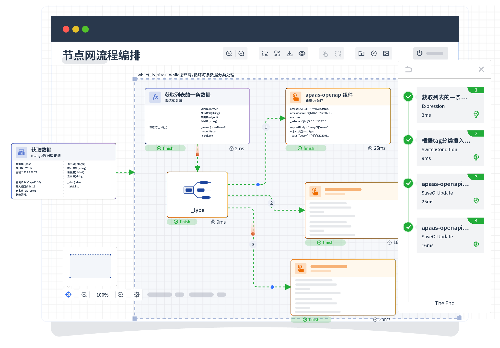 针对集成场景,,,组件定义后支持进行流程编制,,不同于传统代码方式,,,通过图形化展示,,,支持在线调试、、、日志查看和运行回放。。。。