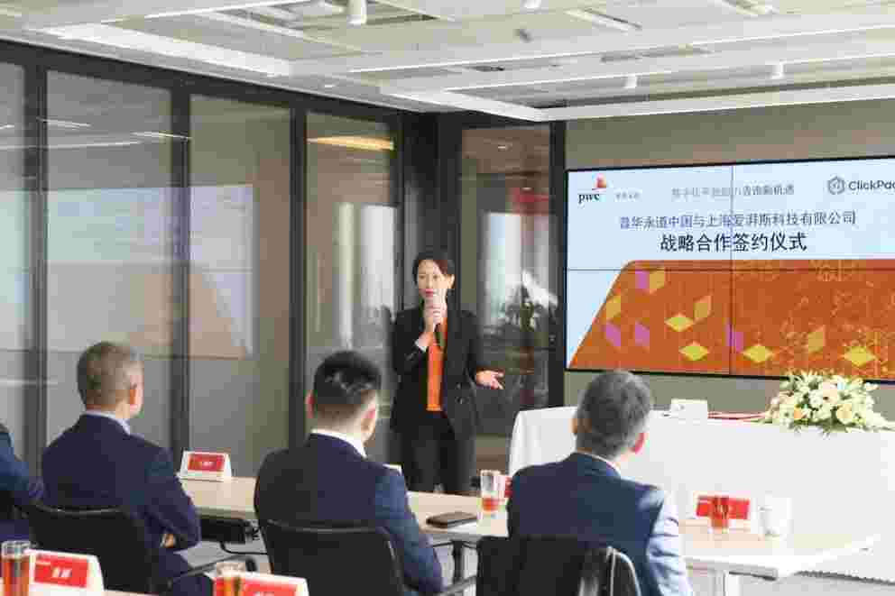 普华永道中国风险及控制服务数字化鉴证和分析服务主管合伙人吕麟晖与钱能钱包首席产品官马俊代表双方签订战略合作协议,,普华永道中国上海主管合伙人黄佳与钱能钱包创始人、、CEO胡柏见证战略合作协议签订过程。。普华永道中国创智中心合伙人林榕作为项目总负责人主持并见证了本次战略合作签约仪式。。。。